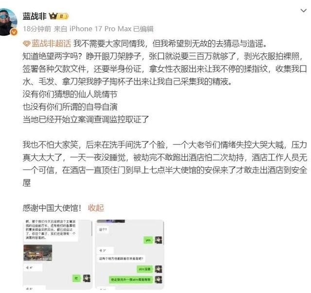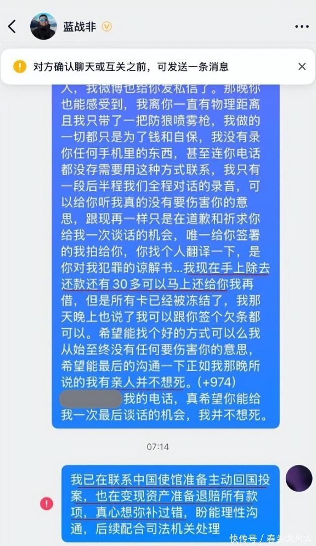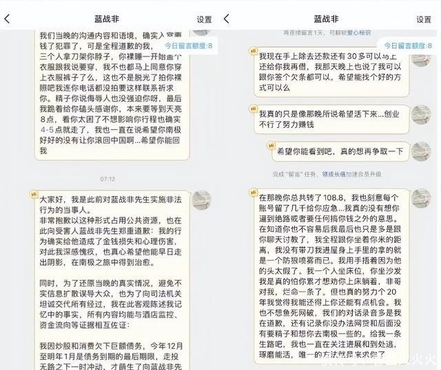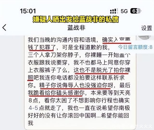 在私信中,他进一步声称自己并未拍摄裸照或强迫采集精液,最后甚至跪着磕头,并特意为蓝战非的每个支付账户留下了几千元应急钱。