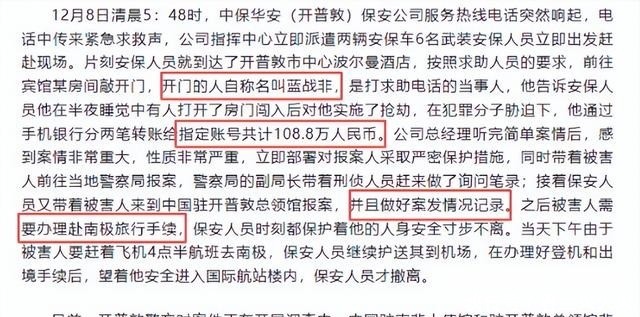鉴于涉案金额巨大,当地警方高度重视,随后派遣了安保人员对蓝战非进行贴身保护,直至其离开南非前往下一站。