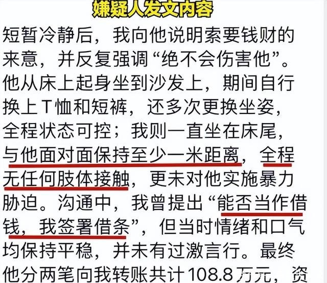 他强调没有仙人跳或自导自演,并补充了更多令人不适的细节,签署各种欠款文件、被迫举起身份证拍照、对方拿出女性衣物让他揉搓以留下指纹等。