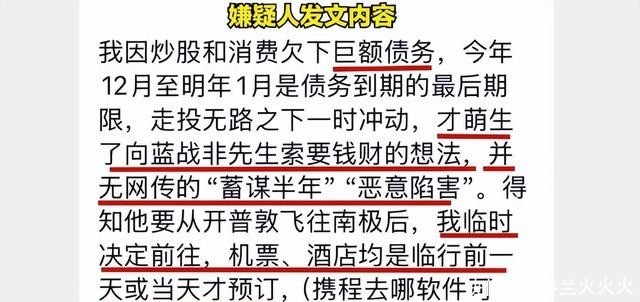 在这份声明中,这位嫌疑人将自己的行为动机归结为个人陷入巨额债务困境,走投无路之下,临时起意瞄准了财力雄厚的蓝战非。