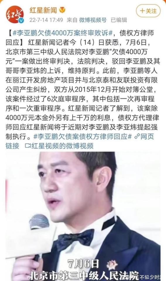 可惜好景不长,命运急转直下。投资项目接连失利,资金链断裂,巨额亏损接踵而至。与此同时,与王菲的婚姻也在2013年画上句号。自此之后,李亚鹏的人生仿佛进入了漫长的寒冬。